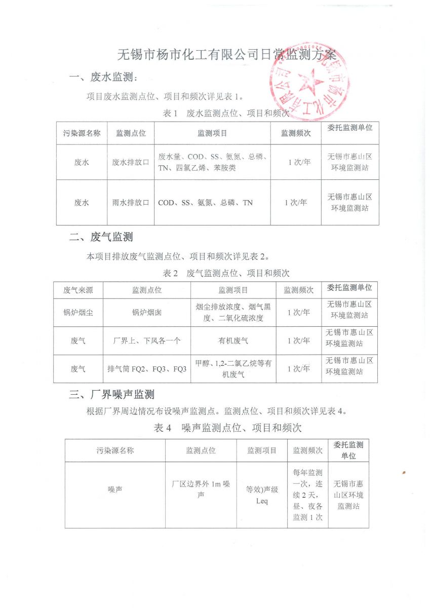 無錫市楊市化工有限公司日常監(jiān)測方案